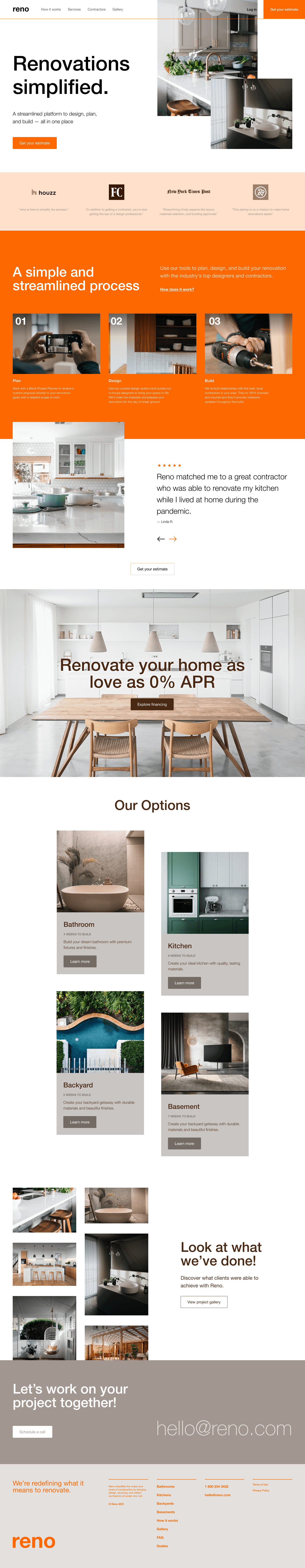The idea behind Reno was to combine everything a user might need; planning, design, and building, into one seamless experience. I designed a responsive marketing website that clearly explains the service, builds trust through testimonials and visuals, and guides users to take the next step (like getting a quote or learning more about service types).